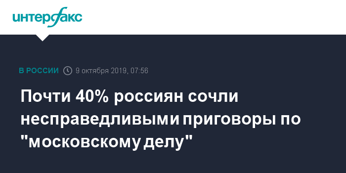 Москва. 9 октября. INTERFAX.RU - Большая часть участников опроса (38%), проведенного "Левада-центром", считают несправедливыми и политически мотивированными судебные приговоры участникам летних акций протеста в Москве.