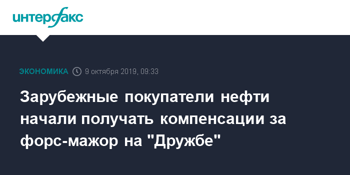 Москва. 9 октября. INTERFAX.RU - Зарубежные потребители российской нефти начали получать компенсации за сбои в ее поставках из-за весеннего форс-мажора на нефтепроводе "Дружба", пишет "Коммерсантъ".