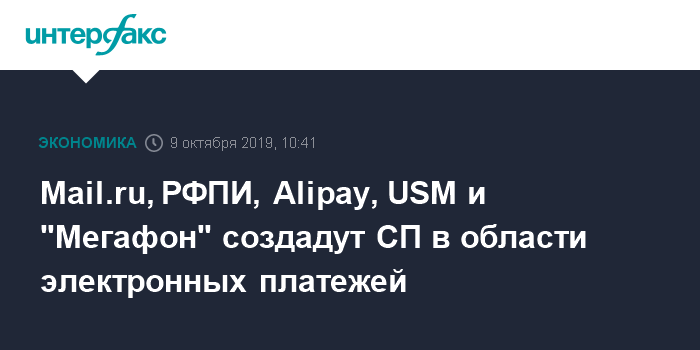 Москва. 9 октября. INTERFAX.RU - Mail.ru Group, платежная система Alipay, USM, Российский фонд прямых инвестиций (РФПИ) и оператор "Мегафон" создали совместное предприятие в области электронных платежей, сообщила интернет-компания.