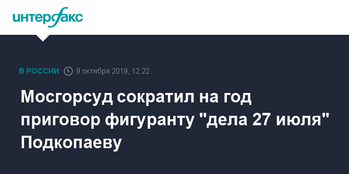 Москва. 9 октября. INTERFAX.RU - Мосгорсуд сократил на год срок наказания фигуранту "дела 27 июля" Ивану Подкопаеву и приговорил его в двум годам колонии общего режима. Ранее подсудимый решил отказаться от признательных показаний, которые дал в первой инстанции.