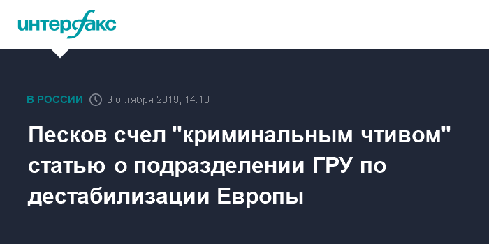 Песков счел "криминальным чтивом" статью о подразделении ГРУ по дестабилизации Европы