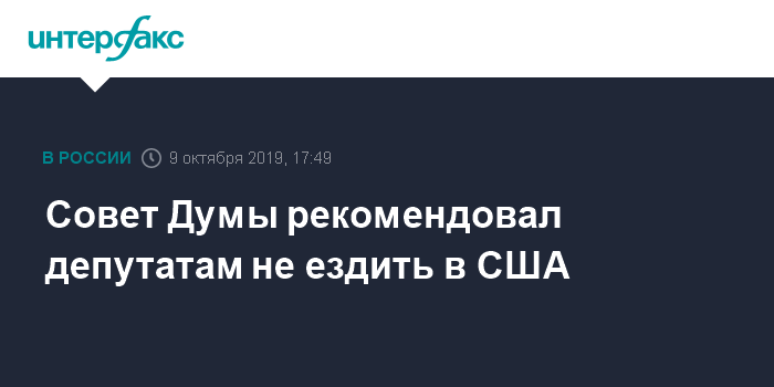 Москва. 9 октября. INTERFAX.RU - Совет Думы рекомендовал депутатам отменить запланированные на ближайшее время поездки в США и крайне внимательно относиться к таким поездкам в будущем. Такое решение было принято после анализа инцидента с задержанием в аэропорту депутата Инги Юмашевой, которую допросил сотрудник ФБР, рассказал председатель комитета по международным делам Леонид Слуцкий.
