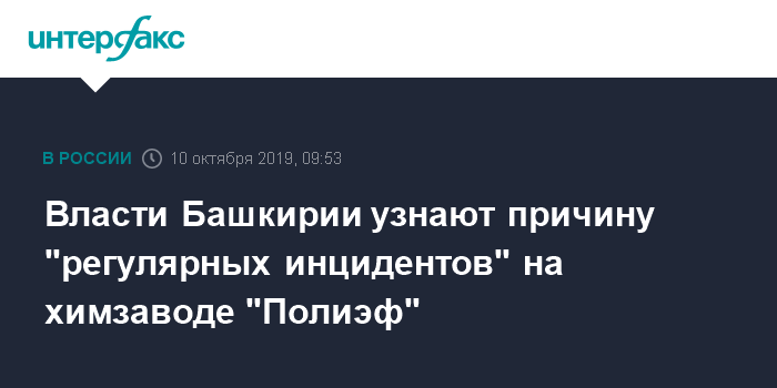 Москва. 10 октября. INTERFAX.RU - Руководство Башкирии обсудит с топ-менеджементом и акционерами завода "Полиэф" "регулярные инциденты" на предприятии, пообещал в фейсбуке глава республики Радий Хабиров.