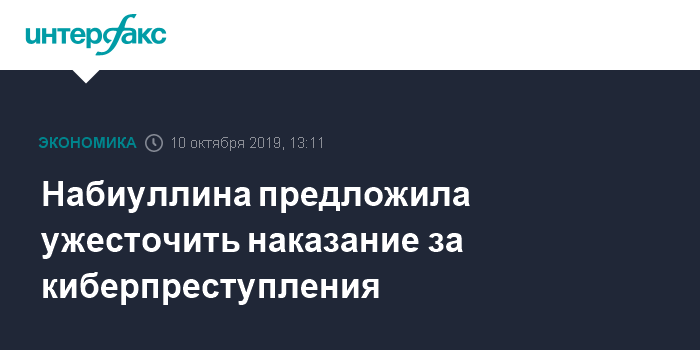 Москва. 10 октября. INTERFAX.RU - Банк России обсудит с участниками рынка ужесточение ответственности за киберпреступления, сообщила председатель ЦБ Эльвира Набиуллина на форуме Finopolis 2019.
