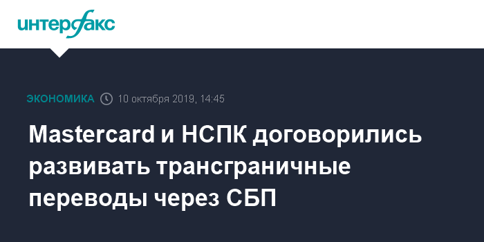 Москва. 10 октября. INTERFAX.RU - Mastercard и "Национальная система платежных карт" (НСПК) заключили соглашение о развитии трансграничных переводов с использованием системы быстрых платежей (СБП), сообщила пресс-служба Mastercard.