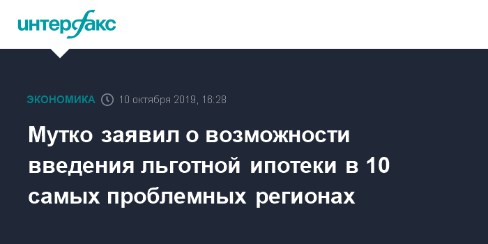 Москва. 10 октября. INTERFAX.RU - Программы предоставления льготной ипотеки могут ввести в 10 регионах РФ с наиболее низким уровнем социально-экономического развития, заявил журналистам вице-премьер РФ Виталий Мутко.