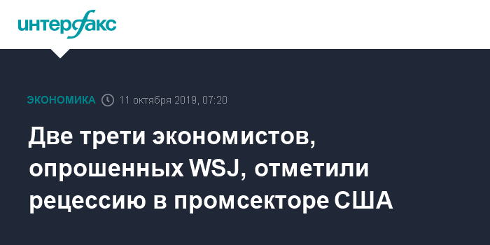 Москва. 11 октября. INTERFAX.RU - Промышленный сектор США находится в рецессии, считают две трети экспертов, опрошенных The Wall Street Journal.
