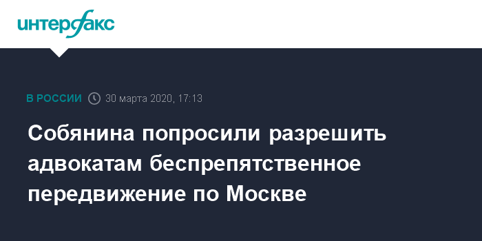 Москва. 30 марта. INTERFAX.RU - Федеральная палата адвокатов России предложила мэру Москвы Серегю Собянину разрешить адвокатам беспрепятственно передвигаться по городу в условиях режима самоизоляции. Об этом говорится в сообщении организации.