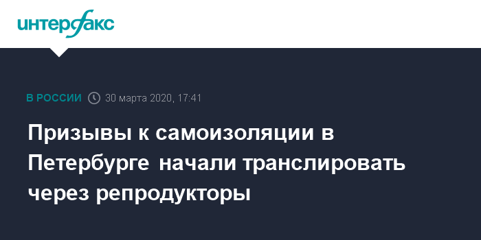 Москва. 30 марта. INTERFAX.RU - Жителей Петербурга по системе городского оповещения попросили соблюдать режим самоизоляции и напомнили об ответственности за его нарушение.