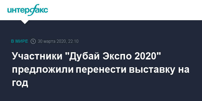 Москва. 30 марта. INTERFAX.RU - Страны - участники международной выставки "Дубай Экспо 2020" (Expo 2020 Dubai) обратились к местным организаторам этого общемирового выставочного шоу с просьбой перенести сроки её проведения на год в связи с пандемией коронавируса.