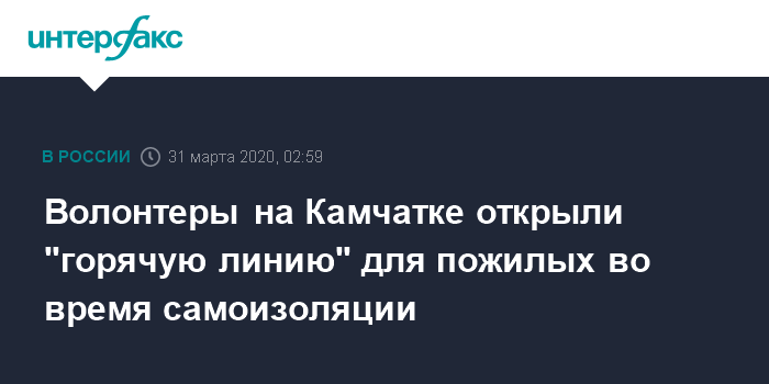Москва. 31 марта. INTERFAX.RU - На Камчатке заработал телефон "горячей линии" для пожилых людей, которым нужна помощь в условиях домашнего карантина, сообщила агентству "Интерфакс" главный специалист Агентства по делам молодежи края Полина Данилина.