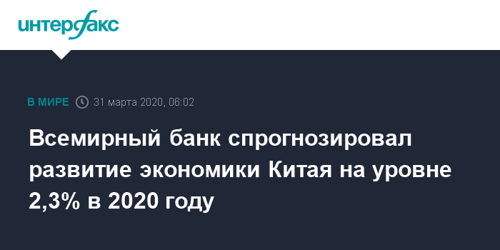 Москва. 31 марта. INTERFAX.RU - Всемирный банк заявил, что темпы развития экономики Китая из-за пандемии коронавируса могут в нынешнем году замедлиться до 2,3% против 6,1% в 2019 году.