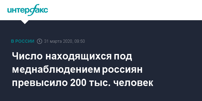 Под медицинским наблюдением в целом по России за истекший период 2020 года находилось 315 609 человек, по состоянию на 30 марта под контролем остаются 201 623 человека, уточняется в сообщении пресс-службы Роспотребнадзора.