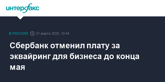 Москва. 31 марта. INTERFAX.RU - Сбербанк сообщил, что отменил плату за сервисное обслуживание терминалов эквайринга и онлайн-касс (эквайринг) для бизнеса в период с 1 марта по 31 мая 2020 года. Эти "каникулы" банк может продлить в зависимости от развития ситуации.
