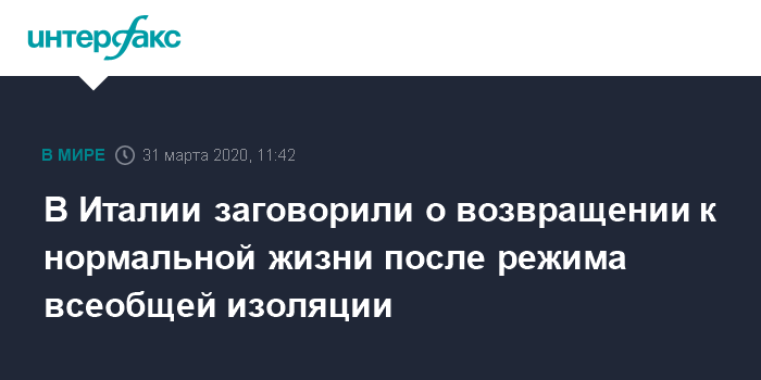 Москва. 31 марта. INTERFAX.RU - Власти Италии обсуждают способы возвращения страны к нормальной работе после режима всеобщей изоляции, введенного из-за коронавируса, пишет во вторник газета Il Sole 24 Ore.