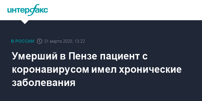 Москва. 31 марта. INTERFAX.RU - В Пензе в больнице умер 75-летний пациент с подтвержденной коронавирусной инфекцией, сообщила пресс-секретарь губернатора Пензенской области Дина Черемушкина.