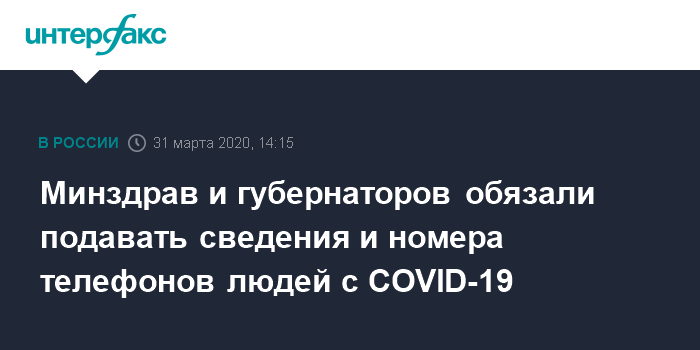 Москва. 31 марта. INTERFAX.RU - Правительство РФ поручило Минздраву России и руководителям регионов с 1 апреля предоставлять в Минкомсвязь и рабочую группу Госсовета по борьбе с коронавирусом сведения о заболевших этой инфекцией и контактировавших с ними лицах.