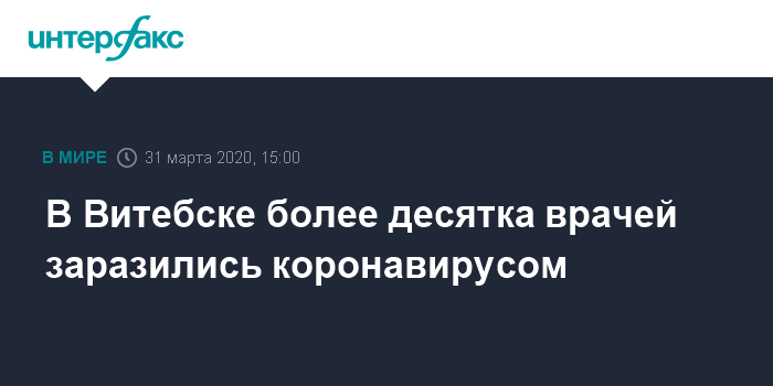Москва. 31 марта. INTERFAX.RU - В Витебске больше десяти врачей заразились коронавирусом, сообщил президент Белоруссии Александр Лукашенко.