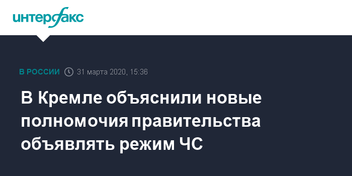 Москва. 31 марта. INTERFAX.RU - В Кремле считают, что правительство должно обладать расширенными полномочиями в условиях борьбы с коронавирусом, поскольку главный штаб находится в кабинете министров.