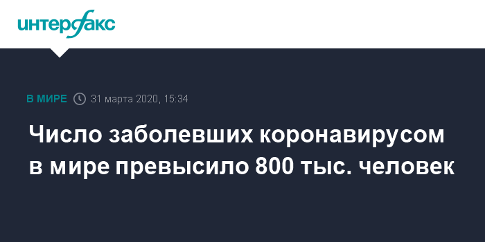 Москва. 31 марта. INTERFAX.RU - В мире зарегистрировано 800 049 случаев коронавируса COVID-19, сообщает во вторник университет Джонса Хопкинса, собирающий статистику по коронавирусу.