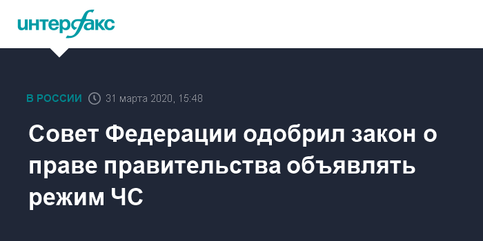 Москва. 31 марта. INTERFAX.RU - Совет Федерации одобрил закон, который расширяет полномочия правительства, в том числе наделяет его правом введения режимов повышенной готовности или чрезвычайной ситуации на всей территории РФ.