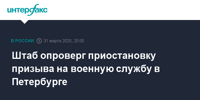 Москва. 31 марта. INTERFAX.RU - Сведения о приостановке призыва на военную службу в Петербурге, распространенные некоторыми СМИ, не соответствуют действительности, заявил замначальника штаба Западного военного округа (ЗВО) по организационно-мобилизационной работе Юрий Брезгин.