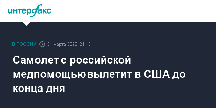 Москва. 31 марта. INTERFAX.RU - Российский самолет с медицинской техникой и средствами защиты может вылететь в США до конца дня, сообщил во вторник журналистам пресс-секретарь президента РФ Дмитрий Песков.