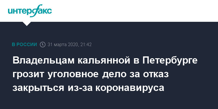 Москва. 31 марта. INTERFAX.RU - В Петербурге могут возбудить уголовное дело против владельцев кальянной, которую не закрыли для посетителей из-за ситуации с коронавирусом, сообщили "Интерфаксу" в пресс-службе регионального главка МВД во вторник.