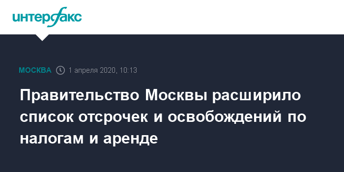 Москва. 1 апреля. INTERFAX.RU - Президиум правительства Москвы принял постановление, расширяющее перечень рассрочек по уплате налогов и освобождению от уплаты арендной платы для отдельных видов бизнеса.