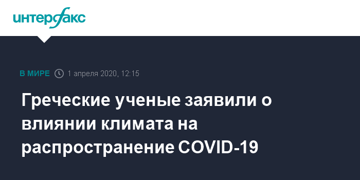 Москва. 1 апреля. INTERFAX.RU - Группа греческих ученых пришла к выводу, что в странах с низкой температурой коронавирус распространяется быстрее, чем с теплой, пишет местная газета "Катимерини".
