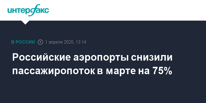 "За минувшие сутки пассажиропоток в крупнейших российских аэропортах просел еще на 5%. Отрасль завершила март на уровне "минус" 75%", - говорится в сообщении.