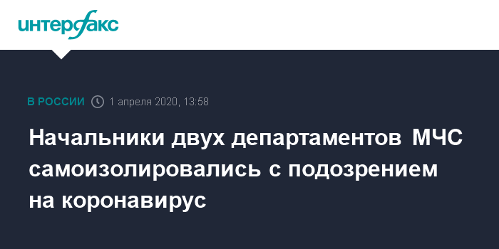 Москва. 1 апреля. INTERFAX.RU - Начальники двух департаментов центрального аппарата МЧС самоизолировались с симптомами ОРВИ и ждут анализов на коронавирус, сообщила представитель министерства Жанна Терехова. Она отметила, что они "проявили бдительность", когда у них немного поднялась температура.