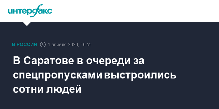 Москва. 1 апреля. INTERFAX.RU - Саратовцы выстроились в длинные очереди во все районные администрации города за специальными пропусками накануне введения пропускного режима, передал корреспондент "Интерфакса".