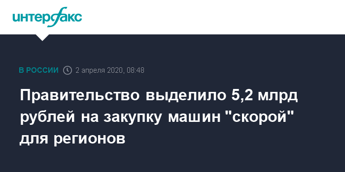 Москва. 2 апреля. INTERFAX.RU - Российское правительство выделило из резервного фонда 5,2 млрд рублей на закупку автомобилей скорой помощи для регионов в рамках противодействия коронавирусу, сообщает пресс-служба правительства в четверг.