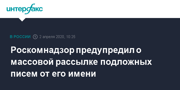 Москва. 2 апреля. INTERFAX.RU - Роскомнадзор предупредил операторов персональных данных о массовой рассылке писем с адресов, не принадлежащих ведомству, с требованием подать уведомление о начале обработки персональных данных и ложной информацией о грозящей административной ответственности за отказ это сделать.