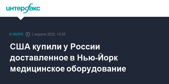 "В продолжение телефонного разговора президента Трампа и президента Путина 30 марта США согласились приобрести у России необходимое медицинское оборудование, включая дыхательные аппараты и средства индивидуальной защиты, которые были переданы 1 апреля в Нью-Йорке Федеральному агентству по чрезвычайным ситуациям", - говорится в сообщении госдепартамента США со ссылкой на Ортэгус.