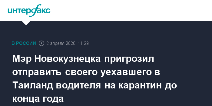 Москва. 2 апреля. INTERFAX.RU - Глава Новокузнецка Сергей Кузнецов резко высказался по поводу своего водителя из-за поездки в Таиланд во время пандемии коронавируса и пообещал оставить его на карантине до конца года.
