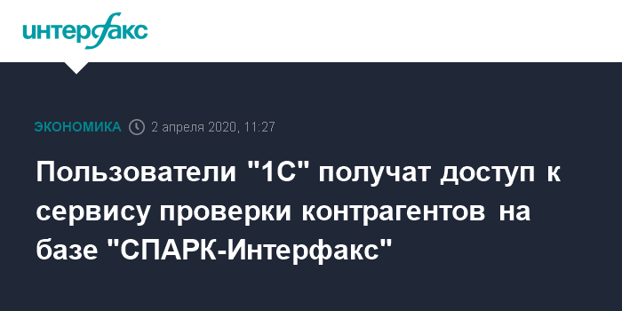 Москва. 2 апреля. INTERFAX.RU - Фирма "1С" и Международная информационная группа "Интерфакс", чтобы оказать поддержку бизнесу в нынешний сложный период, начали предоставлять пользователям программ 1С бесплатный доступ сроком на 60 дней к сервису по проверке контрагентов на базе системы "СПАРК-Интерфакс".