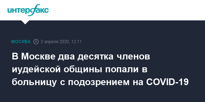 Москва. 2 апреля. INTERFAX.RU - В Москве около 20 членов иудейской общины госпитализированы с подозрением на коронавирус и еще около десятка семей находятся на домашнем карантине, сообщили в пресс-службе Федерации еврейских общин России.