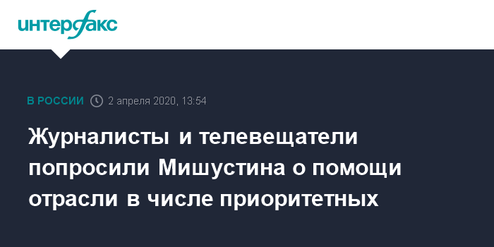 Москва. 2 апреля. INTERFAX.RU - Союз журналистов России (СЖР) и Национальная ассоциация телевещателей (НАТ), куда входят более 600 федеральных и региональных вещательных компаний, просят премьер-министра Михаила Мишустина включить СМИ в список отраслей на приоритетную поддержку правительства.