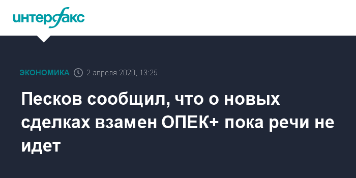 Москва. 2 апреля. INTERFAX.RU - Вопрос о возобновлении сделки ОПЕК+ или заключении какой-то новой договоренности вместо нее пока не обсуждается, хотя стран, довольных ситуацией на мировом рынке нефти, нет, заявили в Кремле.