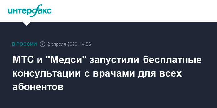Москва. 2 апреля. INTERFAX.RU - ПАО "МТС" и сеть медицинских клиник "Медси" на месяц запускают бесплатные онлайн-консультации с врачами для абонентов любых операторов связи, говорится в пресс-релизе телеком-компании.