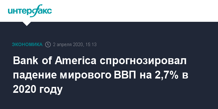 Москва. 2 апреля. INTERFAX.RU - Аналитики Bank of America вновь ухудшили прогноз по динамике мирового ВВП в 2020 году ди теперь ждут его падения на 2,7%. Это значительно хуже, чем рецессия 2008-2009 годов, говорится в отчете.