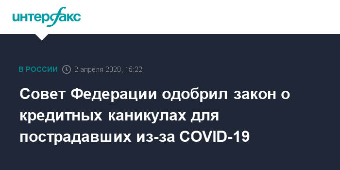 Москва. 2 апреля. INTERFAX.RU - Совет Федерации одобрил закон о предоставлении пострадавшим от пандемии COVID-19 гражданам и компаниям малого и среднего предпринимательства (МСП) права на получение кредитных каникул.