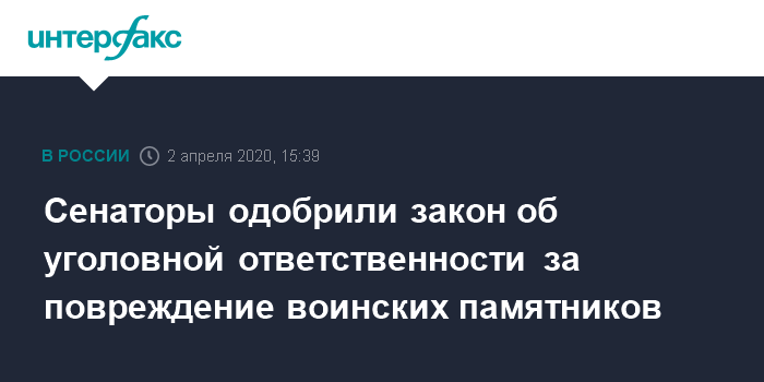 Москва. 2 апреля. INTERFAX.RU - Совет Федерации одобрил президентский законопроект об уголовной ответственности за уничтожение или повреждение воинских захоронений, памятников, обелисков и других мемориалов, связанных с памятью о погибших при защите Отечества или его интересов или с днями воинской славы.