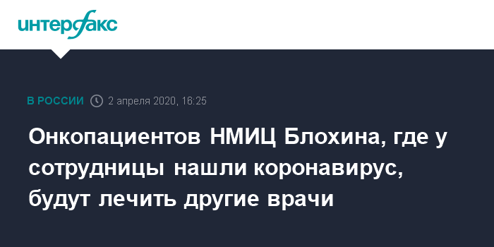 Москва. 2 апреля. INTERFAX.RU - Пациентов отделения химиотерапии НМИЦ онкологии имени Блохина, где у сотрудницы был выявлен коронавирус, продолжат лечить врачи из других отделений, сообщили в пресс-службе НМИЦ.