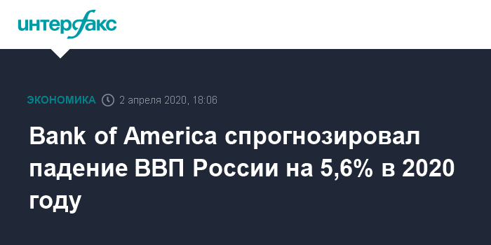 Москва. 2 апреля. INTERFAX.RU - Аналитики Bank of America (BofA) значительно ухудшили прогноз по динамике российского ВВП в 2020 году и теперь ожидают снижения на 5,6%. Ранее они ожидали падения российской экономики на 1%.
