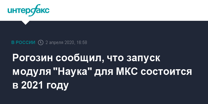 Москва. 2 апреля. INTERFAX.RU - Многофункциональный лабораторный модуль "Наука" будет запущен к Международной космической станции (МКС) в начале 2021 года, сообщил глава "Роскосмоса" Дмитрий Рогозин.