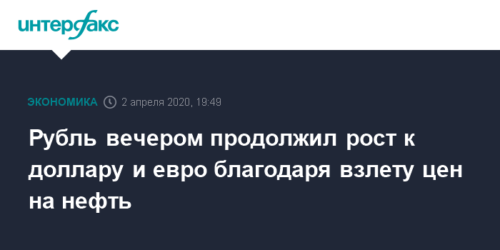Как отмечают эксперты "Интерфакс-ЦЭА", рубль заметно ускорил темпы роста на вечерних торгах благодаря взлету цен на нефть после того, как президент США Дональд Трамп заявил, что ожидает от России и Саудовской Аравии, что они снизят добычу нефти примерно на 10 млн баррелей в сутки и, возможно, гораздо больше. Об этом Трамп написал в своем "Твиттере".