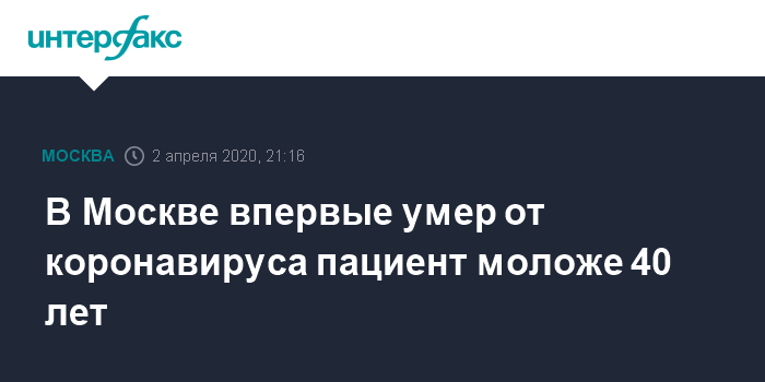 Москва. 2 апреля. INTERFAX.RU - В столице скончался 39-летний мужчина с подтвержденной двусторонней пневмонией и положительным результатом на коронавирус. Об этом сообщил оперативный штаб Москвы по ситуации с коронавирусом в четверг. До настоящего времени в Москве не умирали пациенты с подтвержденным коронавирусом моложе 40 лет.